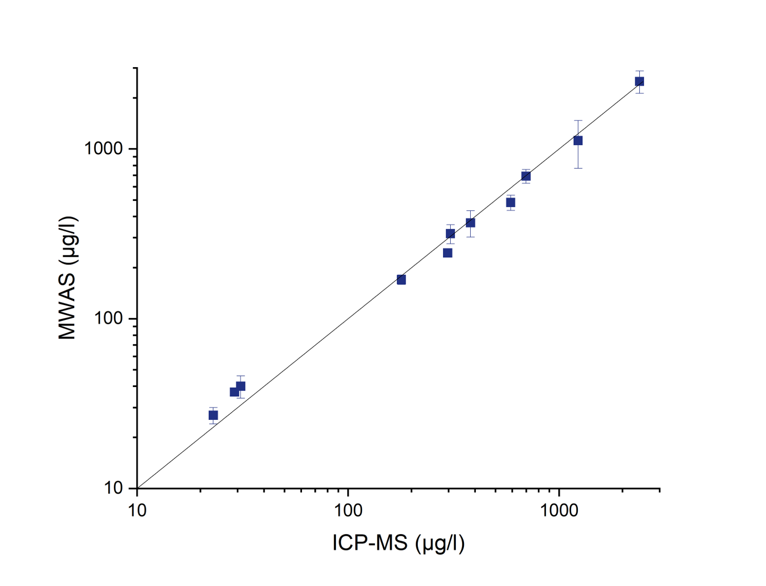 The As analysis has been developed during 2022 – 2023 in collaboration with University of Eastern Finland. It has been validated with variety of water samples from mining and metal processing industries provided by industrial partners. The figure below show how well the MWAS As analysis match with laboratory ICP-MS results with different water samples.